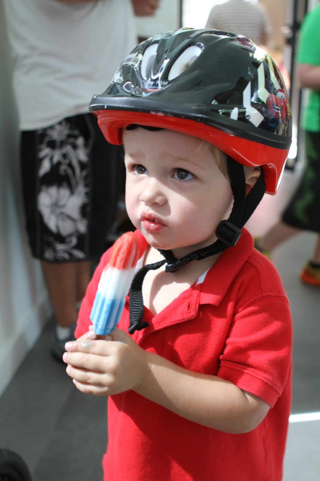 We invited our friends, the Bokishes, from our old Cary ward to meet up with us in the morning for the parade fun. I bought a bunch of decorations thinking we would decorate Kade's wagon for him to pull, but of course he just wanted to ride Liam's bicycle (we've since returned it, which means a balance bike needs to be in the near future for this kid). A firetruck led the brigade to our pool/clubhouse where there were popsicles, drinks, and eventually a bouncy house and lunch.